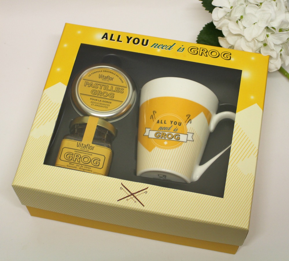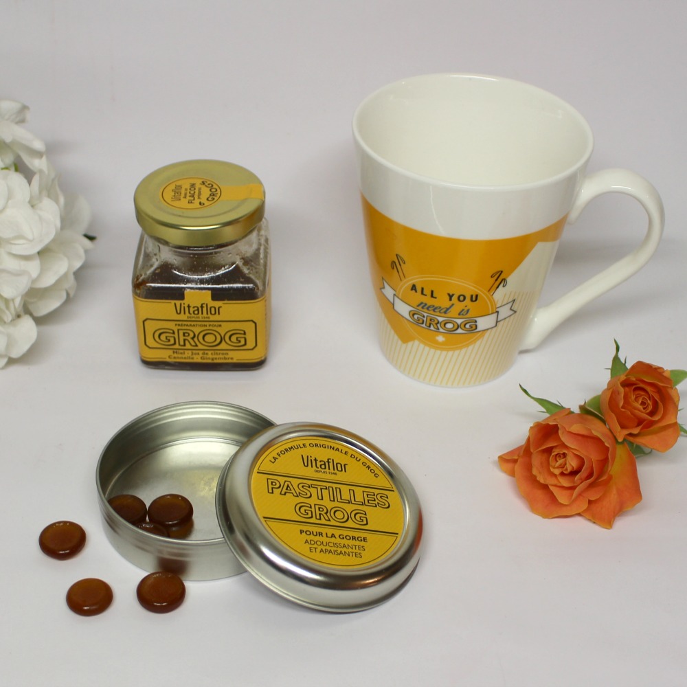Le coffret All You Need is Grog de Vitaflor contient tout ce qu’il faut pour stopper les virus dans leur élan ! La recette ancestrale et originale du grog qui contient du miel, du citron, de l’huile essentielle d’eucalyptus, du gingembre, et de la cannelle se retrouve dans ce joli petit pot. Dans le coffret, il est accompagné d’un mug et de pastilles pour la gorge contenant les mêmes ingrédients naturels et efficaces en cas de maux de gorge, états brumeux ou quand on sent (je sais pas vous mais moi je le sens arriver en général) qu’on est en train de choper un truc…