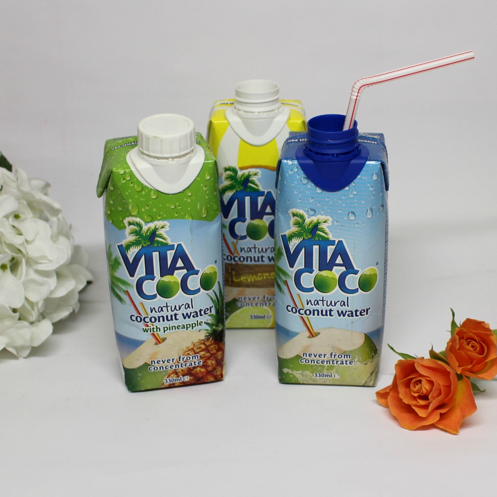 Vita Coco propose de l’eau de coco pure ou additionnée de purée de fruits, sans additifs dans de petites briques, et sous cette forme, c’est tout de suite plus pratique de consommer de l’eau de coco au quotidien ! J’aime le goût de l’eau de coco, un peu particulier, sirupeux et très légèrement sucré… si bien que des parfums que j’ai pu tester, celui que je préfère reste le Vita Coco nature 🙂 Je n’ai pas trop aimé le Lemonade (pourtant j’adore le citron mais le mélange des 2 n’a pas marché pour mes papilles), par contre j’ai bien apprécié celui à l’ananas… Ces petites briques se trouvent dans pas mal de supermarchés mais aussi en ligne 🙂