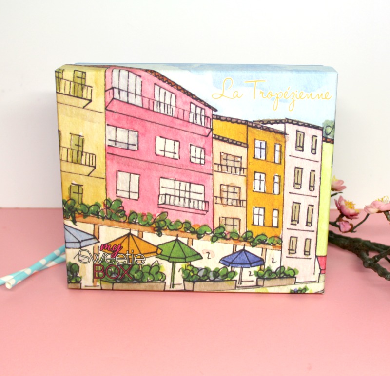 Comme tous les mois, le design est assorti au thème et la box de ce mois ci est toute mignonne avec son dessin coloré ! My Sweetie box est accompagnée du My Sweetie Mag et contient 5 produis et 1 bonus au top pour les vacances avec le thème “La Tropézienne” :