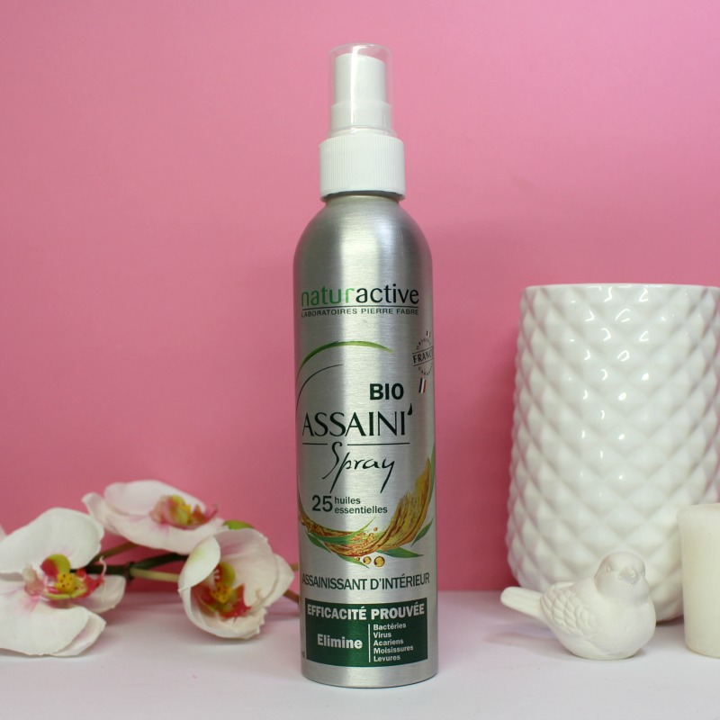 Vous connaissez certainement ce genre de Spray assainissant pour la maison à base d’huiles essentielles, le Assaini’Spray bio de Naturactive a une grande contenance (200 ml), il est bio, écolo (garantie origine france et flacon réutilisable) et contient 25 huiles essentielles pour assainir l’air, et éliminer les bactéries, virus, acariens…