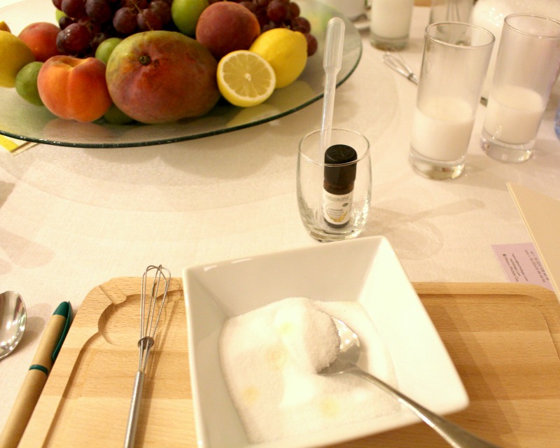 Nous avons fabriqué chacune notre Lait d’Amande parfumé, ainsi qu’un beurre parfumé et un sel de cuisine “amélioré”, c’était non seulement facile, mais aussi très surprenant et on a appris plein de trucs. Nous avions à disposition des HE de citron, pamplemousse, lavande, menthe, carvi et ravintsara. Pour ma part, j’ai parfumé mon lait avec 2 gouttes de menthe (hyper bon et rafraîchissant), la recette est simplissime, il suffit d’ajouter 1 à 3 gouttes d’huiles essentielles dans 20 à 30 cl de lait végétal (attention, une seule goutte pour la lavande).