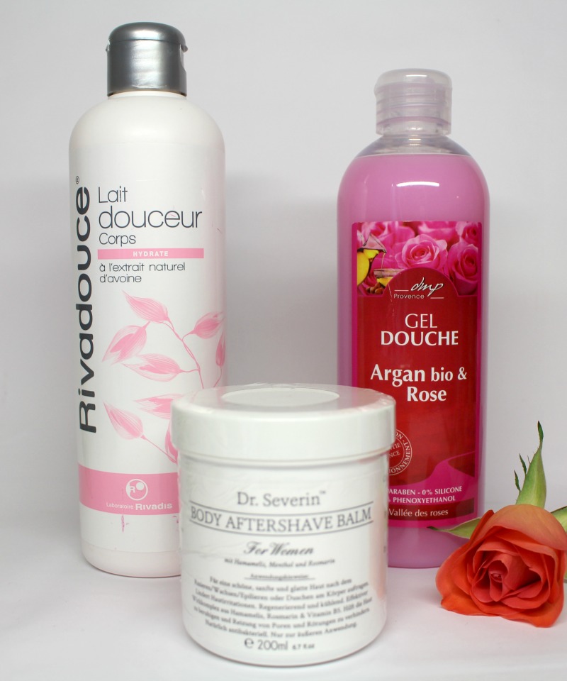 After Shave corps pour Femme du Dr Séverin 200 ml : Je connais ce produit que j’ai déjà utilisé et qui est fait pour apaiser le feu du rasoir, hydrater et soulager la peau aux endroits sensibles, et éviter la repousse sous cutanée. Le produit sent un peu l’homme mais j’aime bien son odeur et il apporte fraicheur immédiate et douceur à la peau, et il dure super longtemps (vous pouvez partager avec votre homme !).