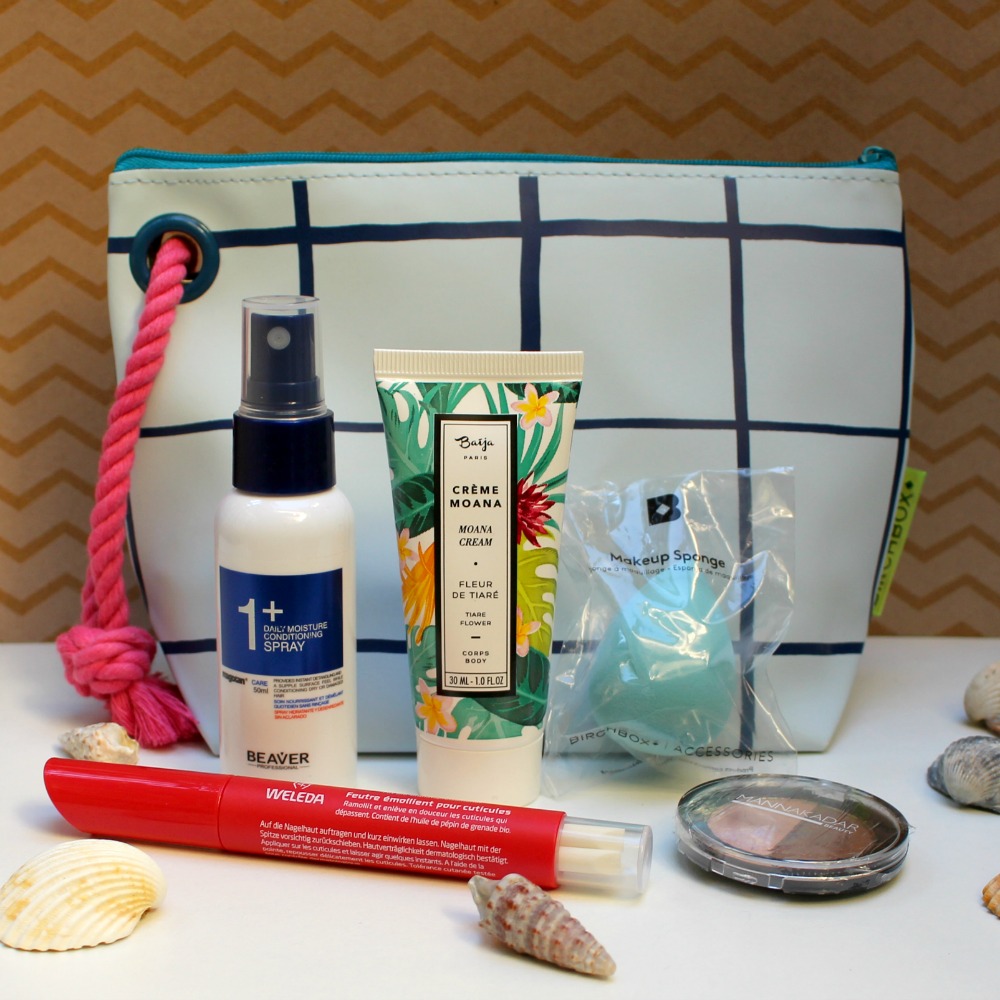 Je vous le disais le mois dernier, j’ai recraqué pour la Birchbox à cause des Pin’s (haha ils ont bon dos les pin’s ^^), et pour l’instant, j’ai bien envie de rester abonnée ! Pour le mois de mars, la box est remplacée par une Trousse imperméable qui sera super pratique que ce soit pour la plage ou pour les vacances, le format est généreux et le motif simple mais mignon. Pour ce qui est du contenu, j’y ai trouvé 5 produits dont 1 accessoire :