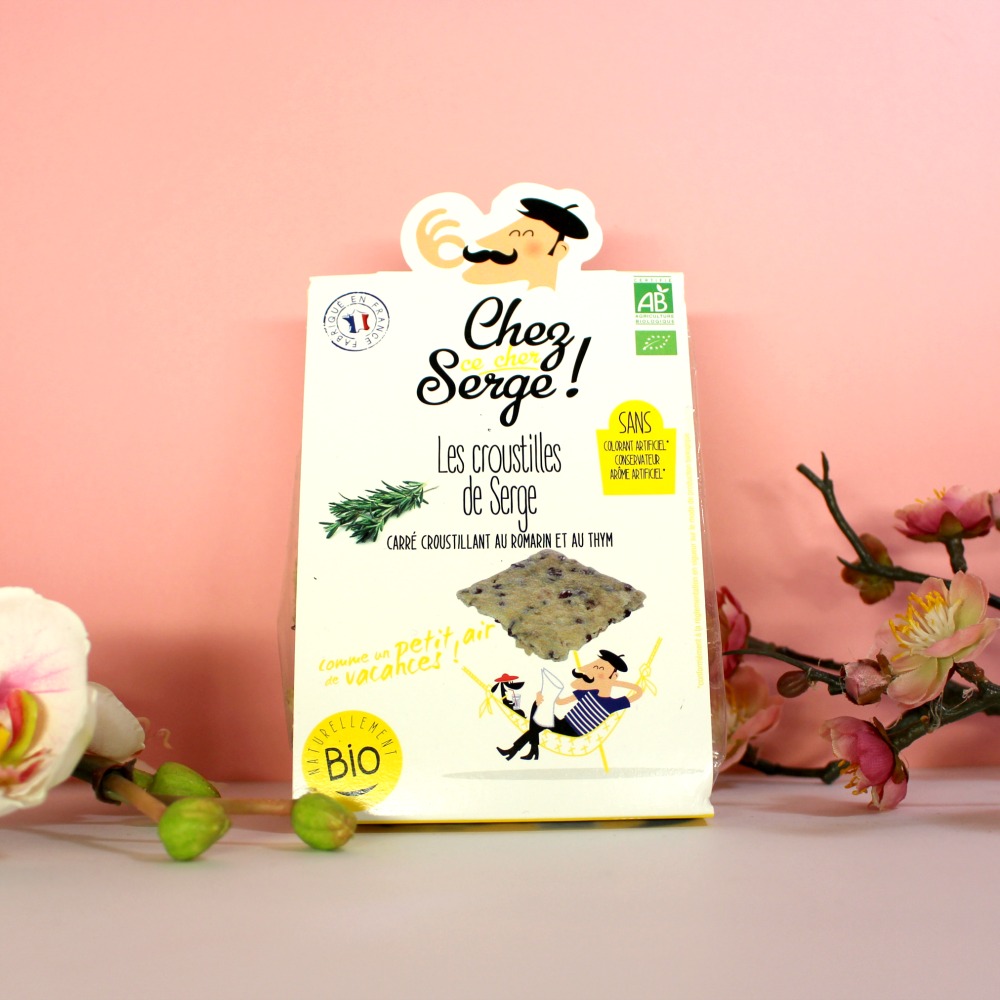 Pour finir, les Croustilles de Chez ce cher Serge sont de petits gâteaux apéritifs avec des graines de lin au parfum (léger) de thym et romarin… Autant vous dire qu’elles n’ont pas fait long feu, avec M.Happy, on a a-do-ré 🙂 C’est bon, ça change, c’est parfumé, ça sent le sud, bref, il a tout bon le Serge 😉 Ravie d’avoir découvert cette marque que je ne connaissais pas ! (valeur 2,50 €).