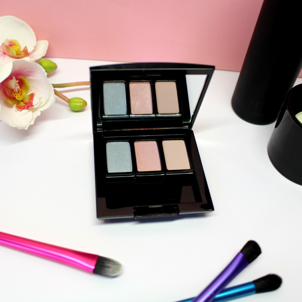 Le boîtier de la mini palette peut être rempli par trois ombres à paupières, ou un blush, ou une crème correctrice… J’ai reçu la teinte Pearly Cloud Dancer (30.68) qui est un bleu gris pastel nacré, le Pearly Gerbera (30.114) est un joli rose pastel nacré. A droite, la teinte Vintage Hydrangea (30.561), un fard poudre mat, hyper fin et crémeux, est un nude mat, de l’exacte couleur de ma peau, très difficile à swatcher donc, mais qui sera parfait pour uniformiser la paupière.