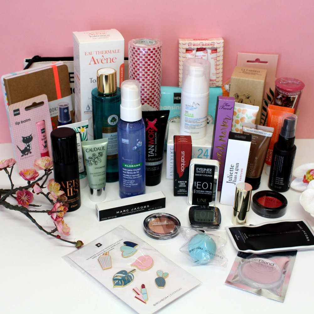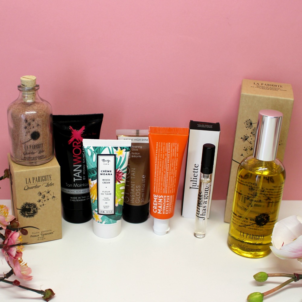 Voilà mes loulous pour le contenu de cette box printannière avec des soins pour faire peau neuve, pour hâler sa peau en douceur, pour se faire un joli make-up frais et prendre soin de soi pendant un bon moment ! Je vous ai déjà parlé de beaucoup de ces produits, vous pouvez taper leur nom dans la barre de recherche sur la droite du blog pour en savoir plus sur eux (les soins La Parigote, l’eyeliner Too Faced, le fond de teint Etam, l’éponge Siliblend, le ral Smashbox, l’Aqua magnifica de Sanoflore, la Crème Moana de Baïja…).
