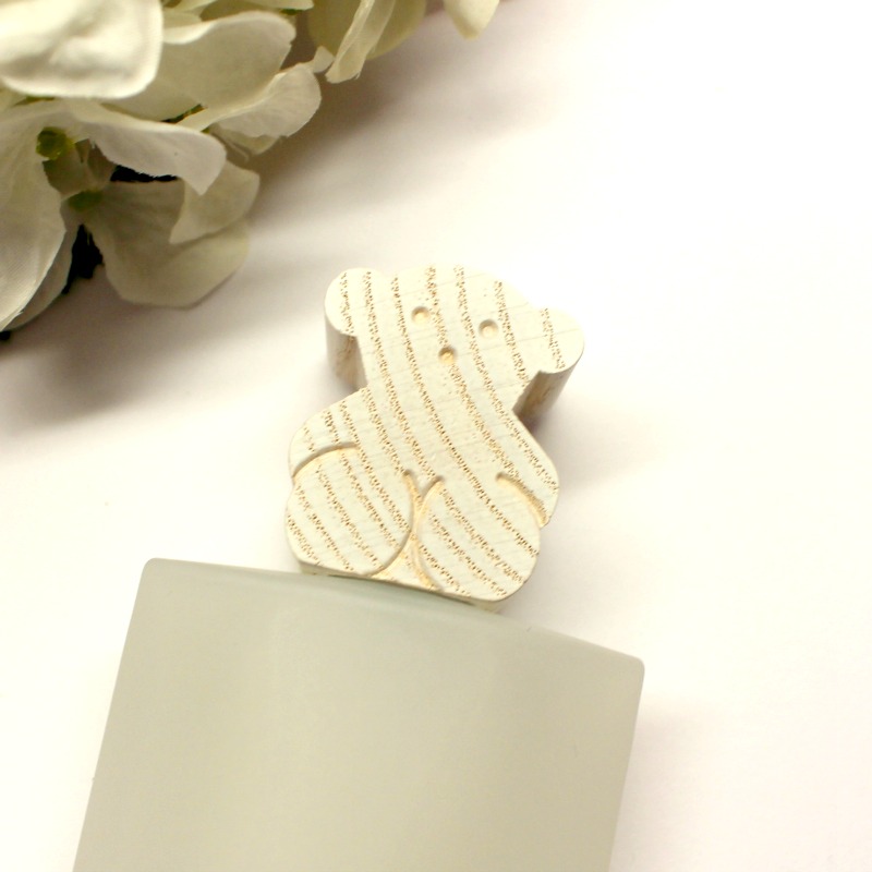 Le flacon est simple mais très joli, allongé, translucide en verre givré, avec le bouchon imitation bois, en forme de petit ours, le Teddy Bear étant l’emblème de la marque. La boîte en carton reprend le motif du bois avec l’ourson en impression argent.