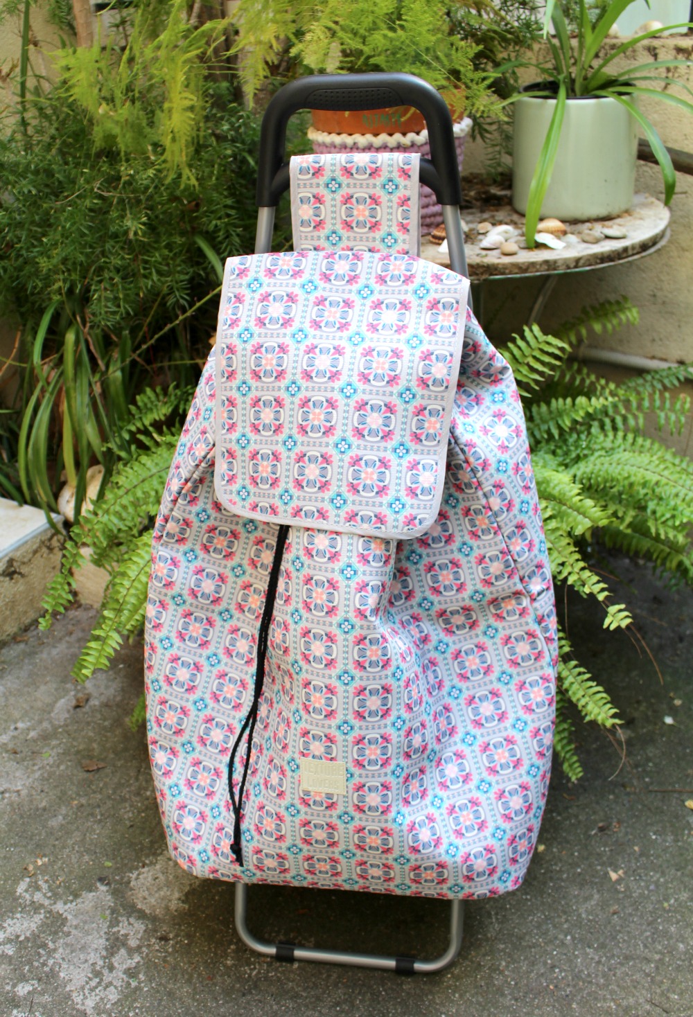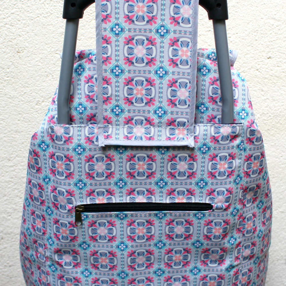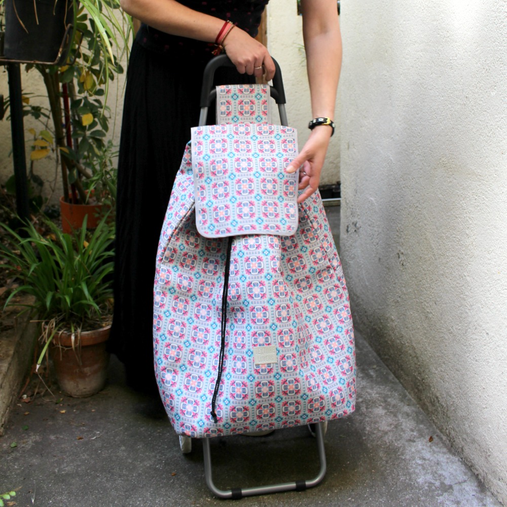 Il existe 8 motifs différents, j’ai choisi le motif Habana dans les tons de rose, gris et bleu, on peut d’ailleurs retrouver ces mêmes motifs sur le site déclinés en accessoires, sacs, et papèterie. Quand je l’ai reçu, je ne m’attendais pas à ce qu’il soit aussi grand ! En plus, il est entièrement pliable et démontable. On peut donc utiliser la structure seule un peu comme un diable, ce que j’ai déjà fait, ou utiliser le chariot avec son sac géant qui est hyper bien pensé.