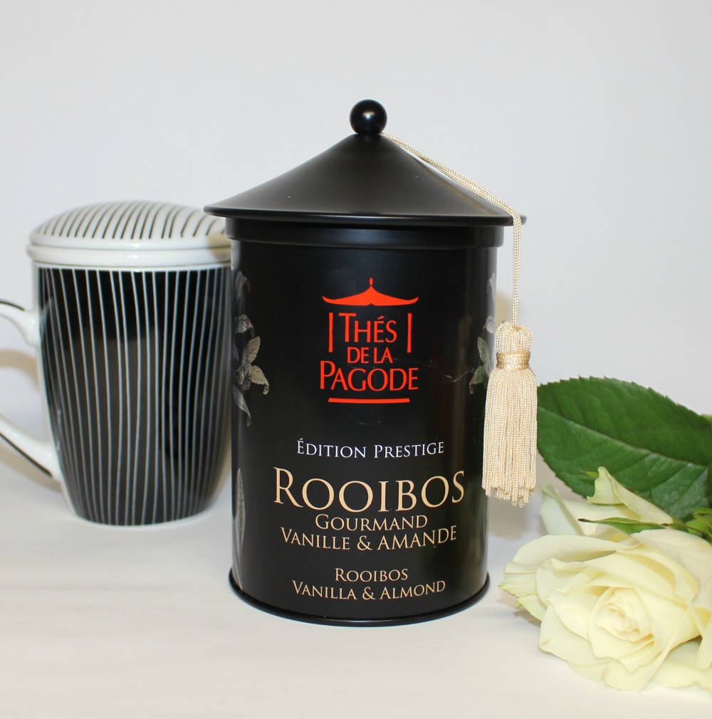 Toujours dans les Thés des Gourmets, il y a le Rooibos Vanille et Amande, que l’on peut boire à tout moment de la journée (car le Rooibos n’est pas un thé – mais un arbuste africain, il ne contient donc pas de théine), et qui lui aussi est super gourmand tout en subtilité. Son odeur est à tomber et c’est une fois de plus une bonne alternative quand on a envie de douceur sans culpabiliser ^^ 13,70 € la boîte de 100 grs sur thesdelapagode.com (prix spécial).