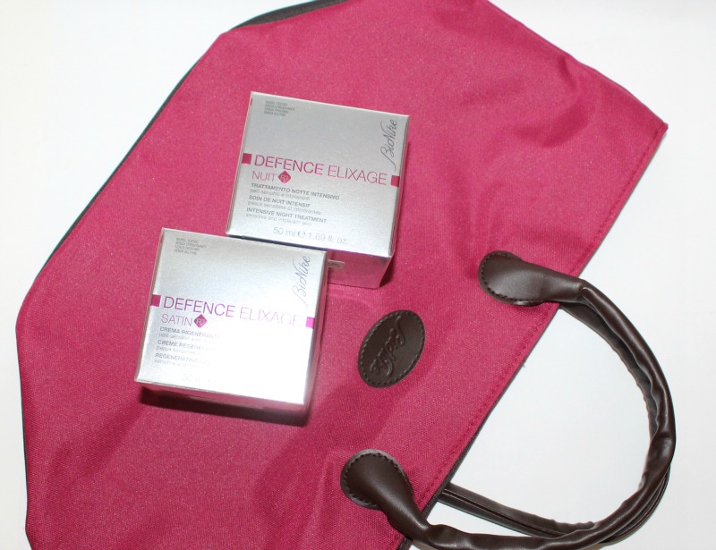 On retrouve de nombreux ingrédients naturels dans les compos et les packagings sont plutôt très sympas (roses gniii), la marque nous a offert un joli sac framboise contenant 2 soins de sa gamme Defense Elixage, une Crème Satin et une Crème Nuit, de quoi découvrir Bionike plus en profondeur 😉
