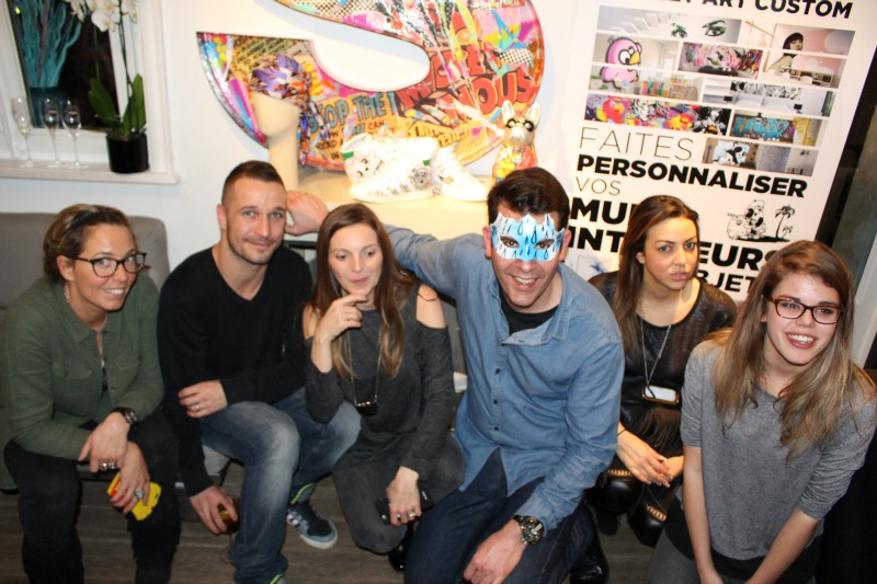 Nous avons toutes reçu un masque customisé à la soirée, que nous avons pu choisir… L’équipe et les artistes présents étaient vraiment cool (il en manque sur cette photo), j’ai passé un très bon moment à papoter et échanger avec eux ! Le loup que j’ai choisi a été customisé par Intox.