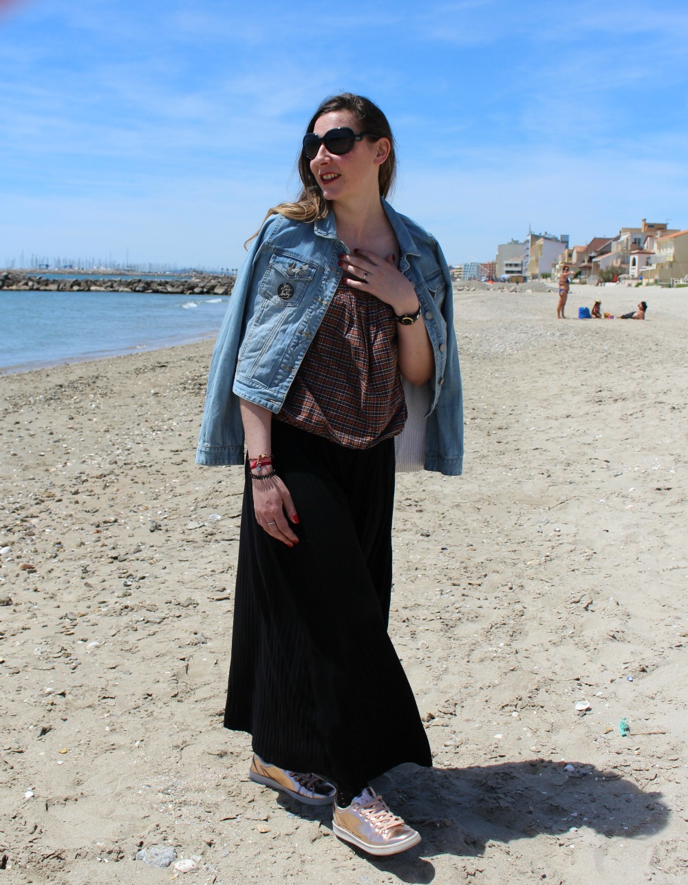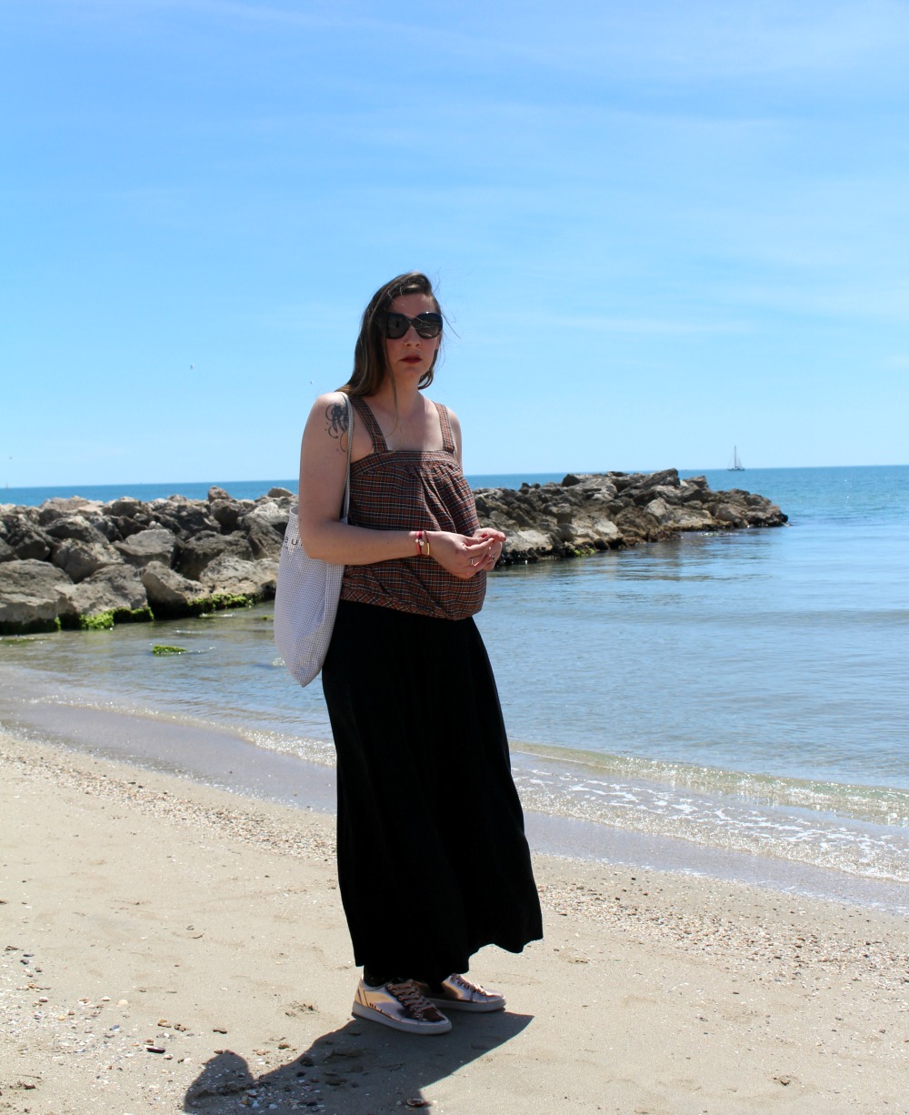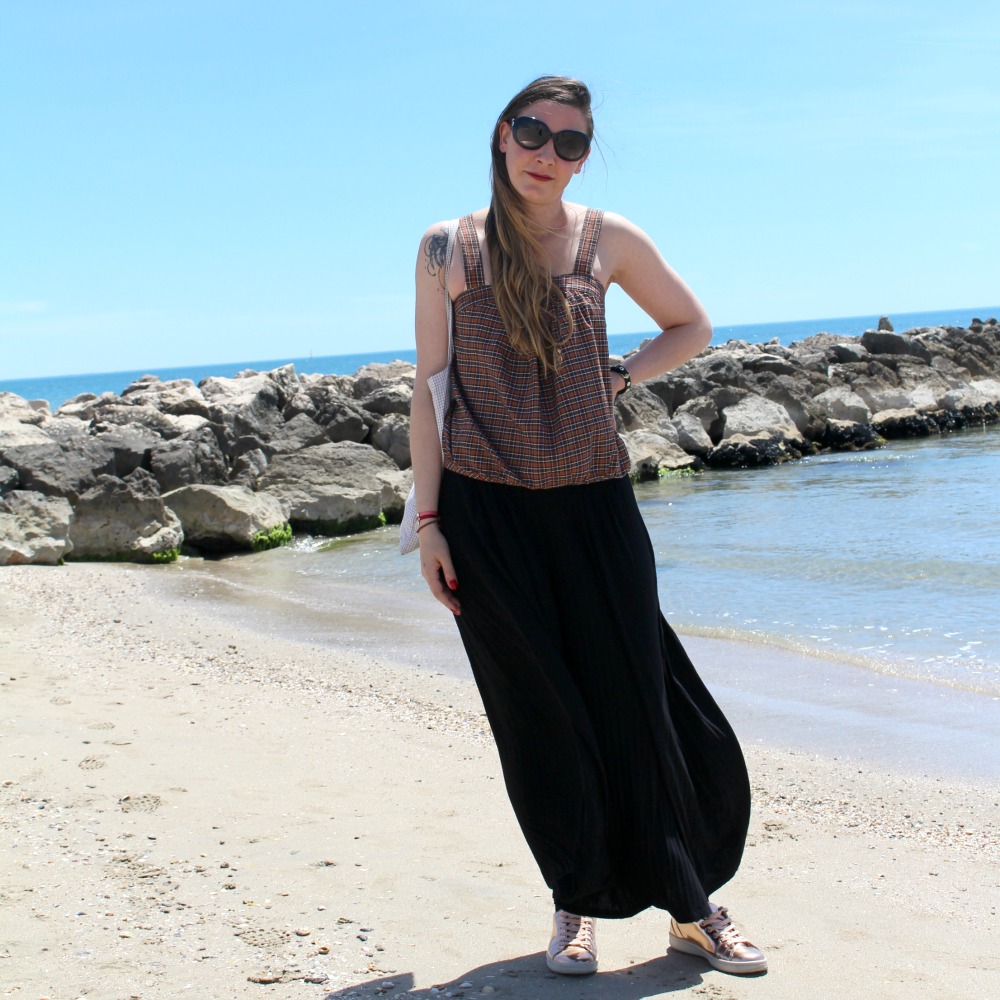C’était mi mai, lors d’une journée à la plage entre copains… Je n’avais pas prévu de me baigner, mais il faisait chaud et je voulais être à l’aise, j’ai donc revêtu le vêtement qui a fait la fin de mon été dernier (et qui risque bien de faire celui ci ^^) : Ma Jupe culotte Bershka <3 Noire, fluide (elle est en jersey), avec un élastique à la taille… Elle va aussi bien avec des spartiates qu’avec des baskets, et c’est ultra méga agréable à porter. Cela change du jean, c’est plus pratique qu’une jupe, je suis trop bien dedans et je trouve qu’au passage ça allonge la silhouette (même si je suis déjà grande). C’est le genre de vêtement dans lequel on est aussi à l’aise que dans un pyjama !