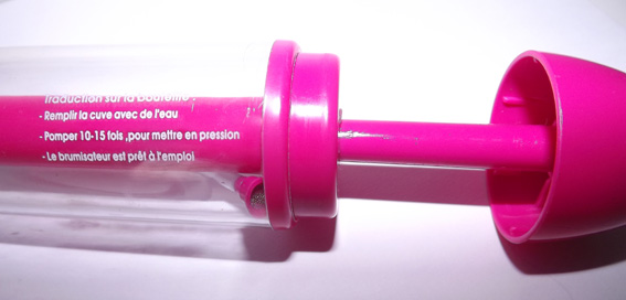 On pompe 10 / 15 coups avec l’embout rose du bas (l’homme a pété le premier en pompant comme un mulet, donc 10 / 15 coups pas plus ^^), puis on appuie sur le petit bouton sous le spray et on vaporise aussi longtemps qu’on le veut, puisqu’il y a de la pression.