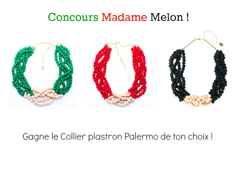 Un concours est en cours sur la page facebook du blog pour remporter le joli Collier Plastron Palermo (valeur 69 €) de Madame Melon dans la couleur de votre choix ! Je l’ai rallongé le concours de quelques jours pour que tout le monde puisse participer, avec ma semaine de foufou, je n’ai pas trouvé le temps de vous parler de la marque avant, alors Bonne chance à vous si l’esprit de la marque vous a charmé ! Vous avez jusqu’à mardi soir (31 mai) pour tenter votre chance ICI.