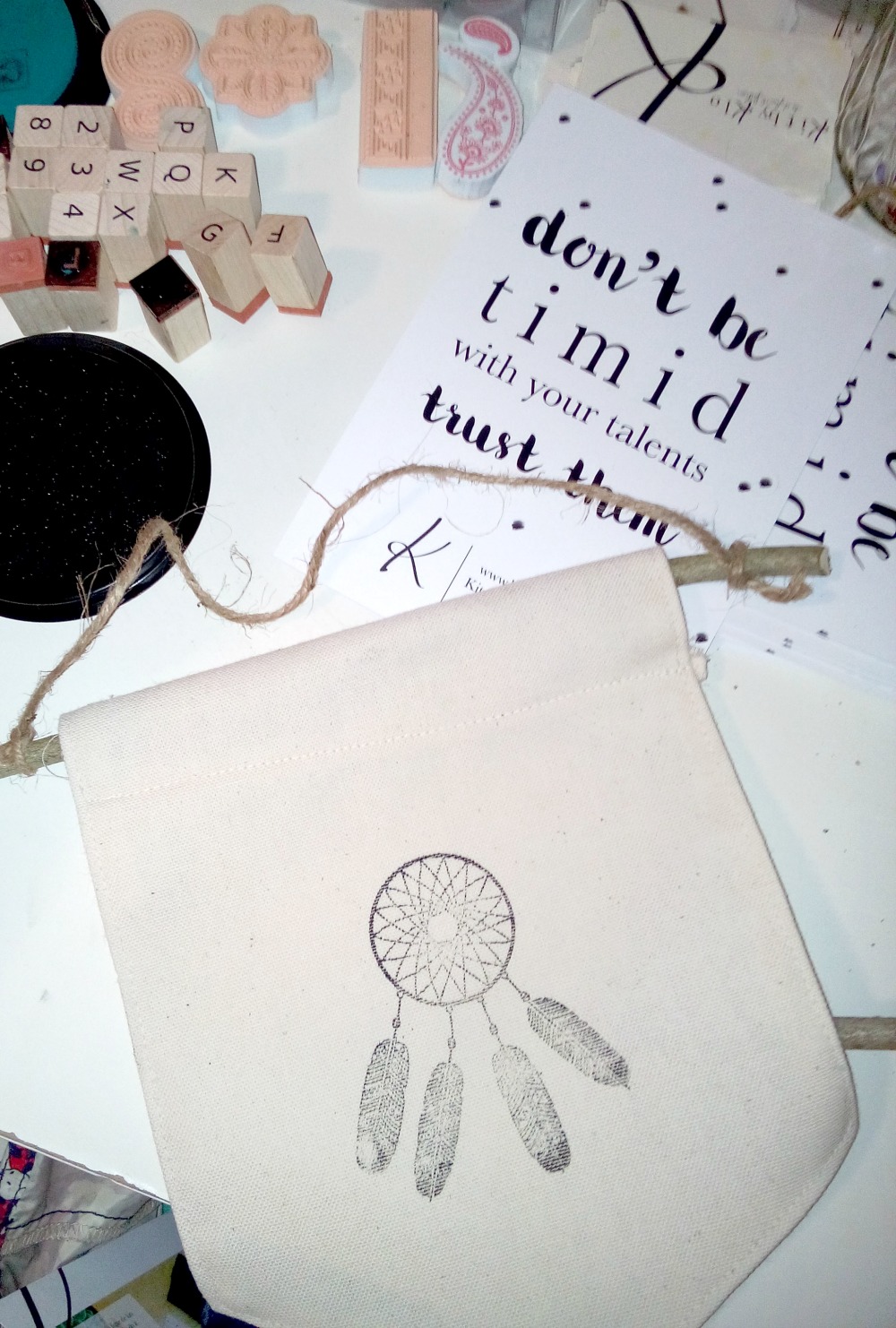 Ce fut ensuite au tour de Klo une créatrice et blogueuse sur kitbyklo.com – qui propose des kits DIY adorables – d’animer un petit atelier ludique pour customiser un fanion à accrocher à son mur pour une déco bohème et dans l’air du temps. On a passé un très bon moment (on a bien ri encore une fois) et j’ai préféré finir mon fanion au calme chez moi car j’étais trop déchaînée et fatiguée (levée à 4h ce jour là) pour être créative !
