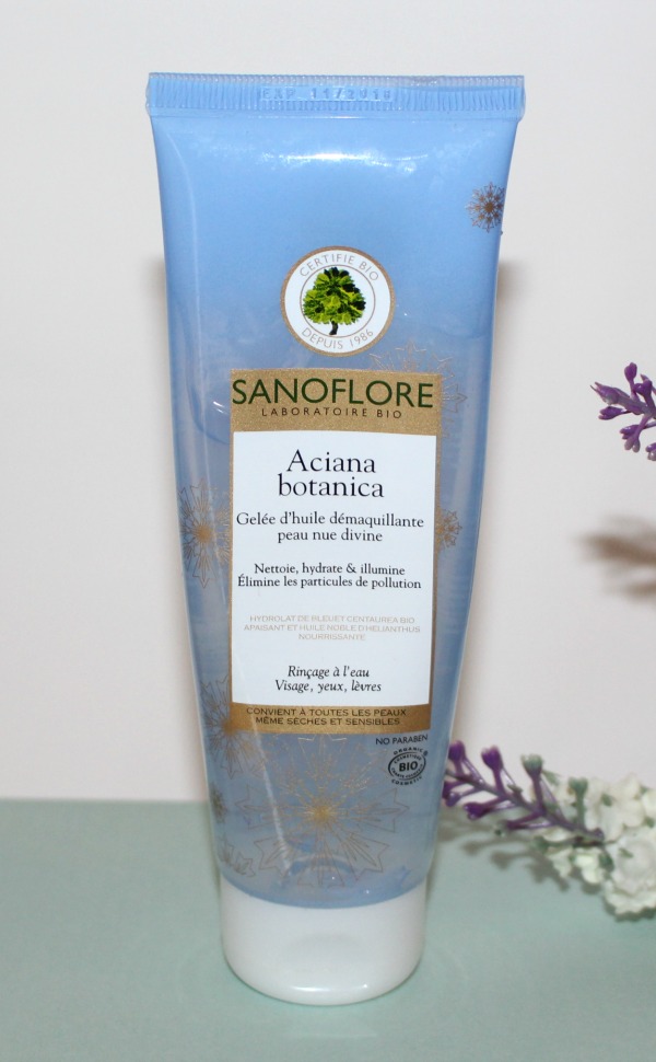 Je passe ensuite au démaquillage du visage, avec des produits Sanoflore de la nouvelle gamme au bleuet Aciana Botanica. Je commence par appliquer La Gelée d’Huile démaquillante Peau nue Divine qui est un produit parfait pour les peaux sensibles que j’apprécie particulièrement parce que super rapide et qu’il réunit 2 étapes en 1.