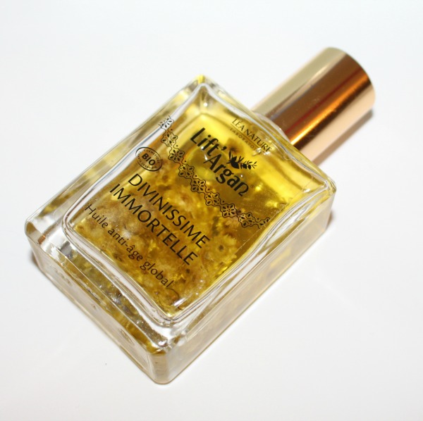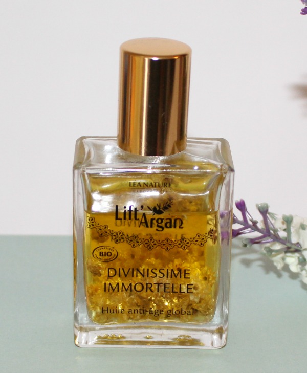 Pour le soin, c’est simple et rapide, j’utilise L’Huile Divinissime Immortelle de chez Lift’Argan, qui se présente en flacon de 50 ml. Cette Huile est une sorte de Macérat puisque des fleurs d’Immortelle baignent dedans.