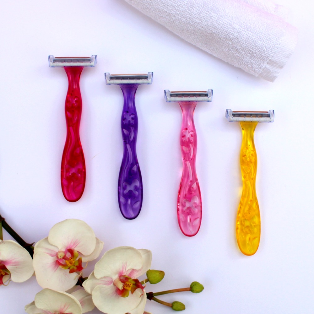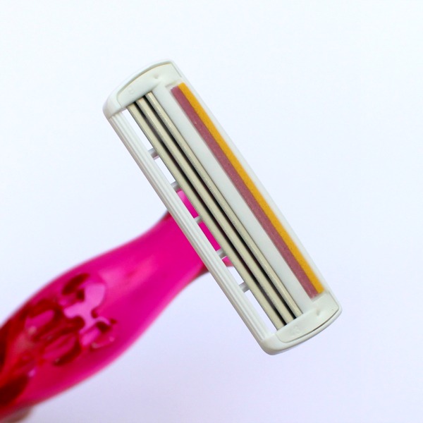Chaque rasoir (jetable) a une tête composée de 3 lames et d’une bande violette à la vitamine E. Ils rasent d’ultra près, il suffit de se caresser la jambe avec pour que tout disparaisse sans effort et sans agresser la peau. La première fois que j’en ai utilisé un, j’y suis allée d’un peu trop près (et je me suis coupée ^^), il n’y a vraiment pas besoin d’appuyer sur la peau pour un rasage précis avec ces rasoirs ! Si vous cherchez des rasoirs jetables, efficaces, girly et faciles à trouver dans le commerce, vous pouvez opter pour ces rasoirs BIC Miss Soleil les yeux fermés (En supermarchés ou grandes surfaces).