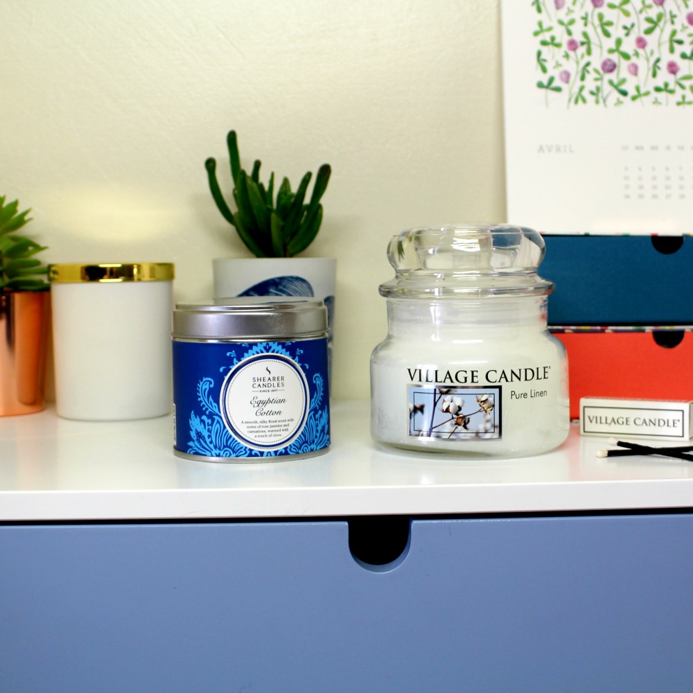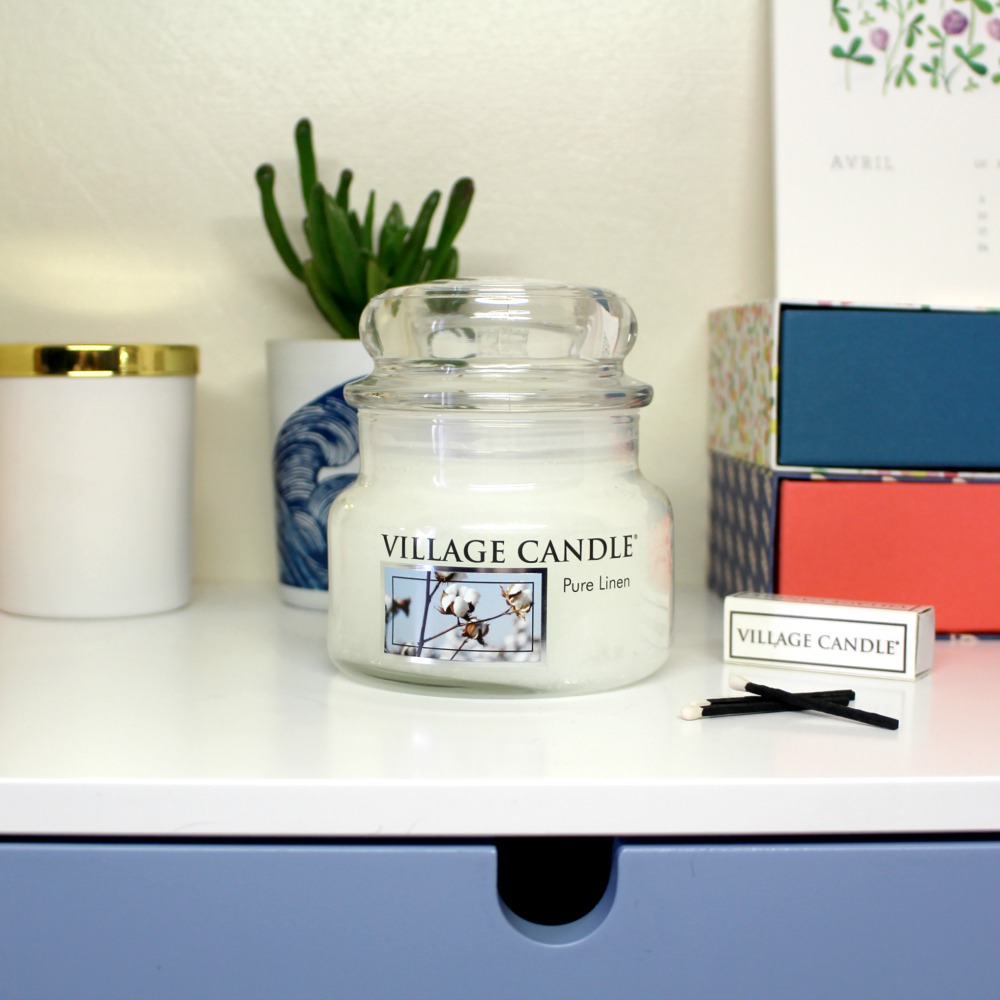 Ensuite, j’ai choisi la bougie Pure Linen de Village Candle, qui a 2 mèches et pèse 700 grs, pour 45 h de combustion (je dirais +). Celle ci sent vraiment bon le propre et le frais aussi, peut-être un peu plus dans un esprit lessive.