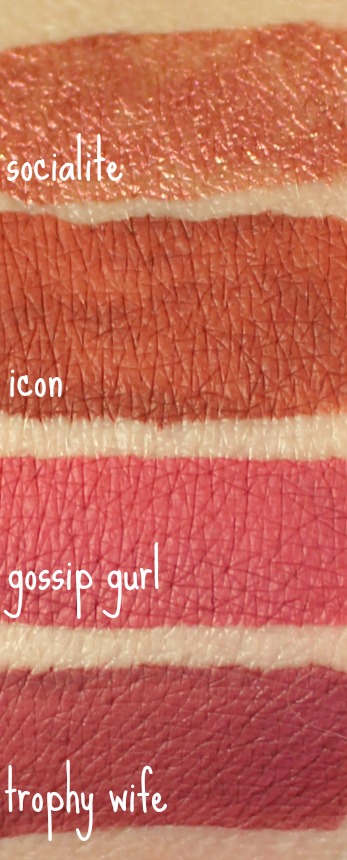 Gossip Gurl est un bois de rose magnifique, un nude rosé qui donne à la bouche un côté “mes lèvres en mieux”. Trophy Wife est un rose mauve tout aussi canon, Icon est un brun rosé, une sorte de rouille vraiment réussi et Socialite est une des fameuses nouvelles teintes en exclu, un rose gold irisé / métallisé tirant sur le pêche.