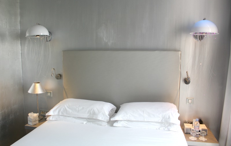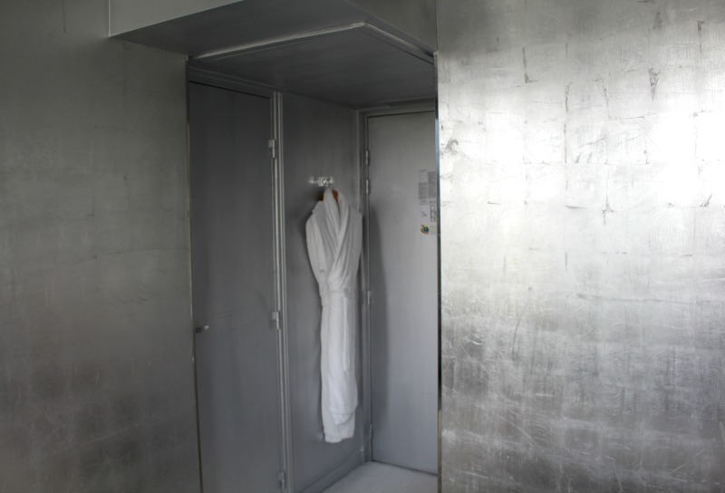 Chaque chambre de l’hôtel a une déco particulière et pour nous pas de voyage aux Pays des Merveilles, mais plutôt un voyage spacial 😉 Nous avons logé dans la Chambre Argent, qui comme son nom l’indique est entièrement argentée !