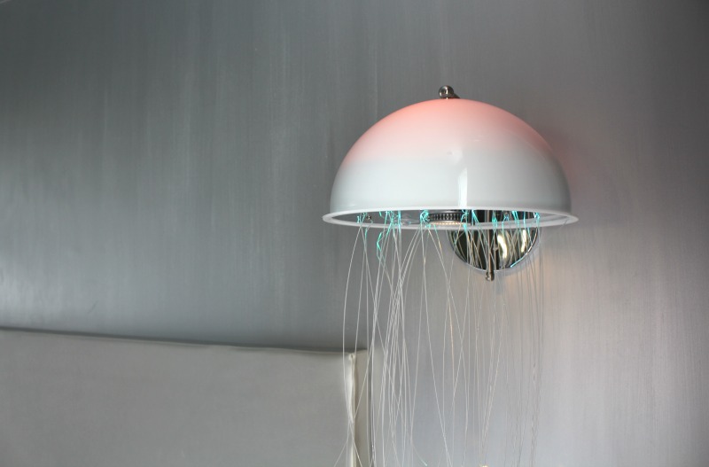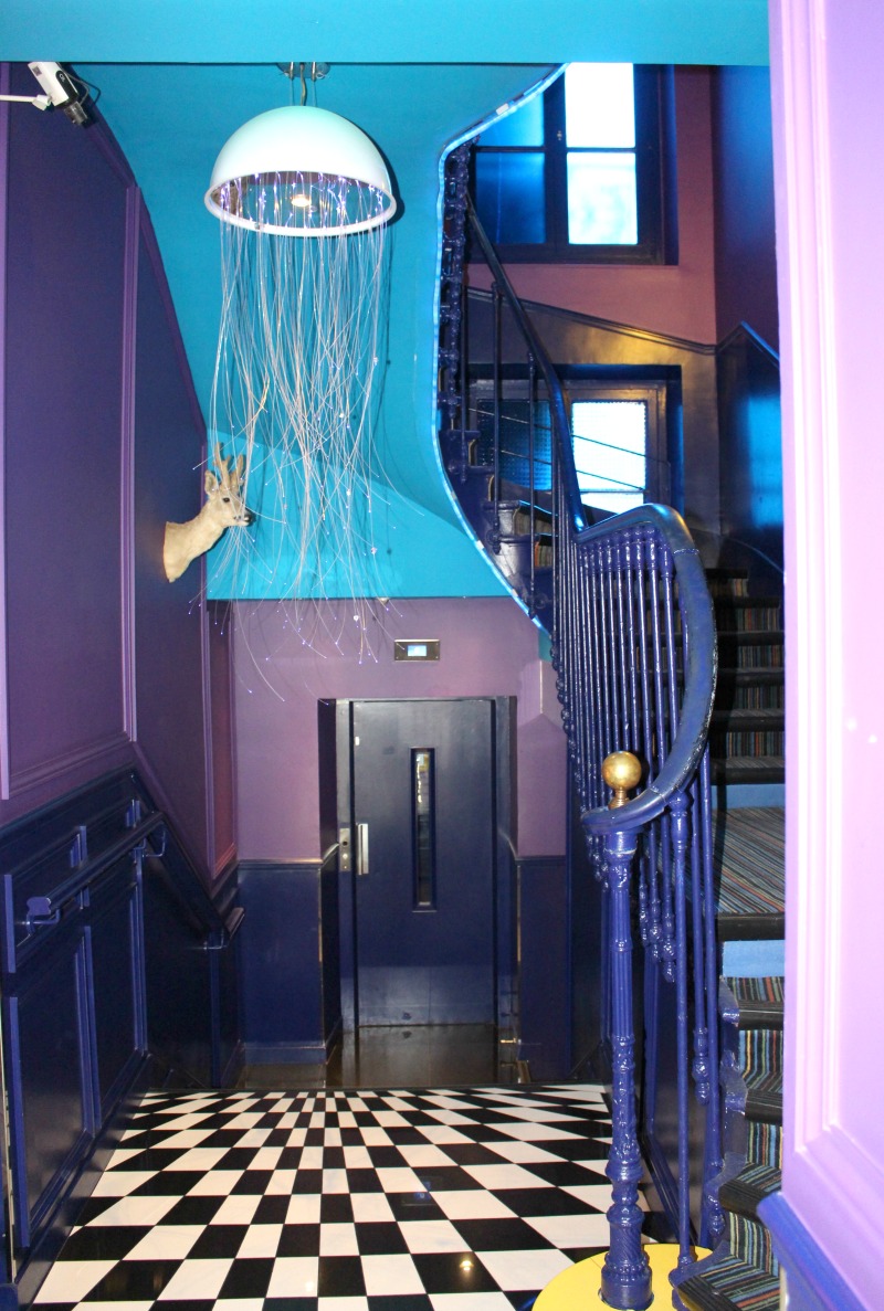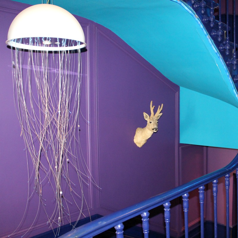 Nous étions au 5ème étage et le petit couloir pour mener à l’ascenseur et à la salle de petit déjeuner est dans le ton du reste, j’adore, le sol avec distorsion, la lampe méduse (on en retrouve un peu partout dans l’hôtel), le trophée, les couleurs… On a été conquis par la déco !