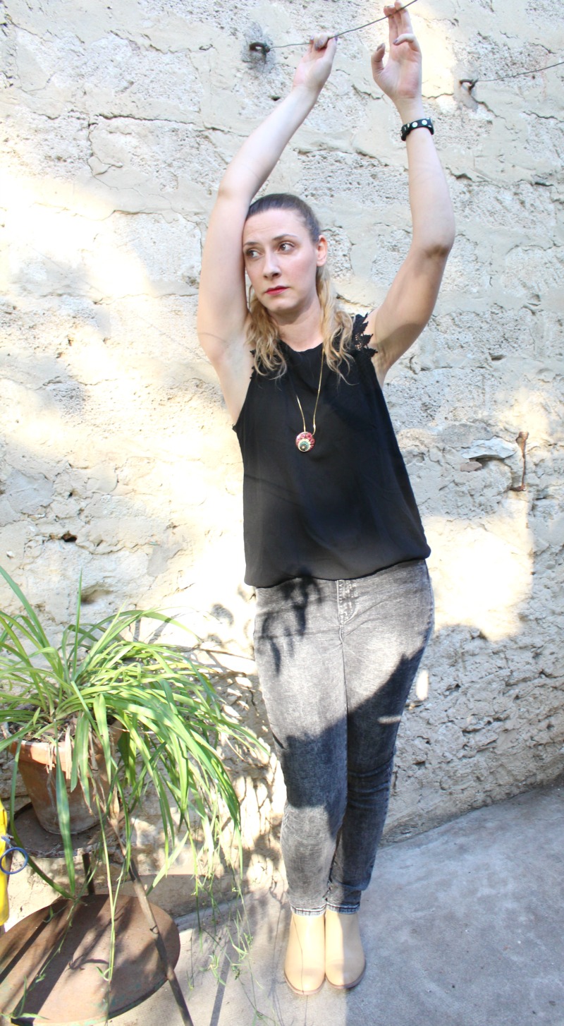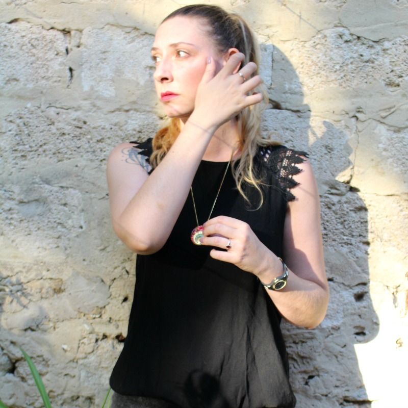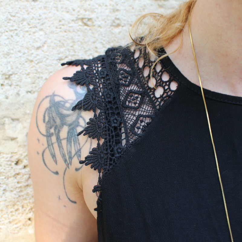 Pour l’autre pièce, j’ai choisi un Top noir et fluide avec détails au crochet sur les épaules. Il est facile à marier avec tout, confortable, léger et je le trouve super joli. Je le porte volontairement à l’envers sur les photos, je préfère l’échancrure du dos qui est plus raz du cou.