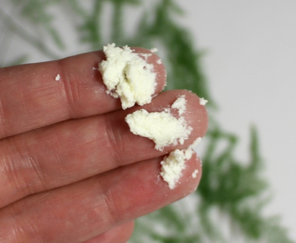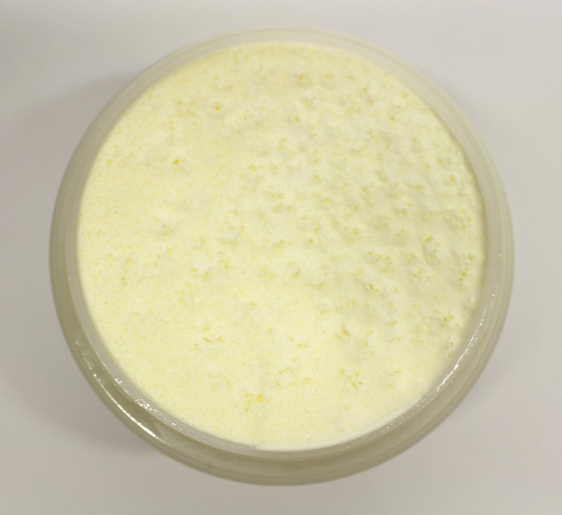 C’est une sorte de grosse chantilly très compacte qui sent délicieusement bon le frais et le citron. Le beurre fond tout seul sur la peau et pénètre assez vite en chauffant, c’est un pur plaisir à appliquer, il assouplit tout de suite l’épiderme, et le nourrit en profondeur.