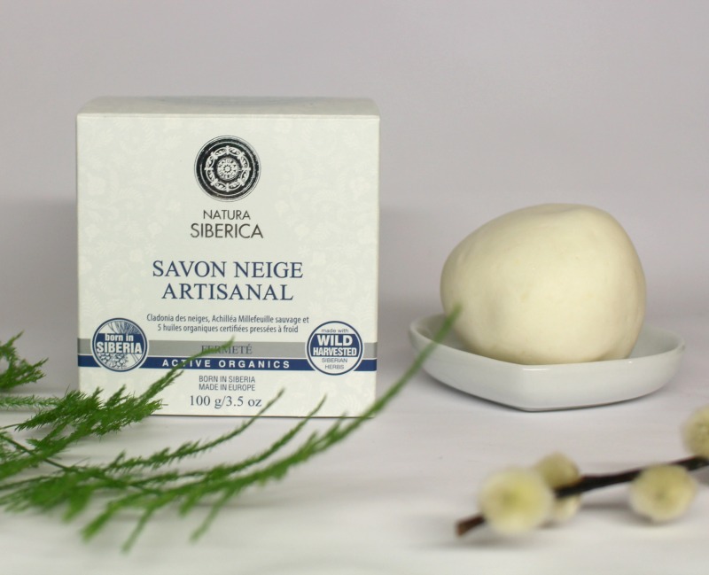 Tout d’abord, le Savon Neige Artisanal est le produit qui m’a fait tomber amoureuse de la marque, quand je l’ai senti la première fois, j’ai tout de suite été transportée par l’odeur de ce gros savon en forme de boule de neige. C’est donc une grosse boule blanche et irrégulière de 100 grs que vous découvrez en ouvrant le papier en même temps que le parfum qui s’en dégage ! La composition est impressionnante pour un savon, il contient des huiles d’olive, de coco, de graines de cassis, de tournesol, de blé, d’argousier, de bourrache, de graines de framboise arctique, ainsi que des extraits de Cladonia des Neiges (un lychen qui supporte les grands froids), gorgée d’acide usnique pour lutter contre le vieillissement de la peau.
