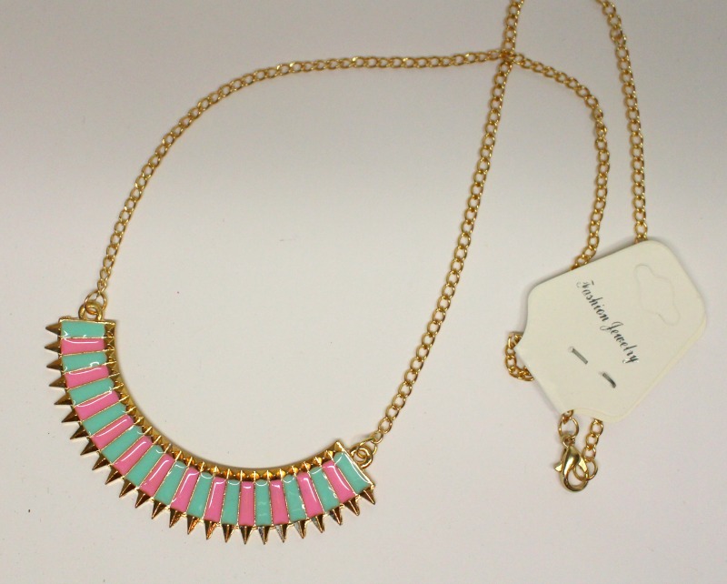 Collier géométrique Rose et Mint 1,63 € : Il est trop joli et un peu mieux fini que son copain, la chaîne est un poil trop longue à mon goût, ce n’est pas grave, je vais la raccourcir, mais j’adore les couleurs et le rendu !