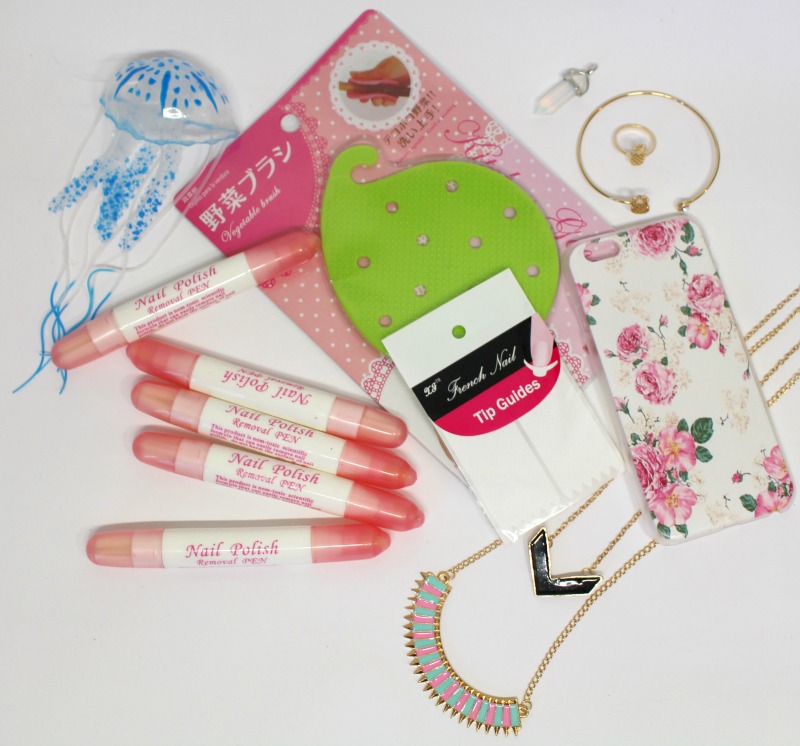 NéeJolie, c’est un site Chinois qui propose plein de produits à petits prix (style AliExpress), ça va des bijoux en passant par le make-up, des ustensiles de cuisine, de la déco, de la papèterie ou des coques de téléphones, des fringues… Bref, un peu de tout comme ma commande peut en attester ^^ Le site m’avait contacté pour me proposer de remplir un panier pour 20 € et voici ce que j’ai choisi :
