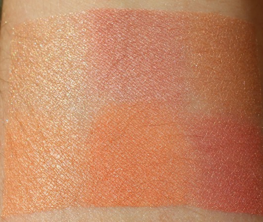Comme son cousin Sweet Peach il contient des micro paillettes qui apporte un petit côté highlight très sympa… Le tout est bien pigmenté, je vous conseille donc d’y aller mollo avec votre pinceau, attention aux surprises. Les micro paillettes contenues dans ces blushs ne sont pas trop sparkly, juste ce qu’il faut, on évite l’effet boule à facettes tout en ayant un joli effet glowy naturel. (le Peach beach en haut, le Sparkling bellini en bas).
