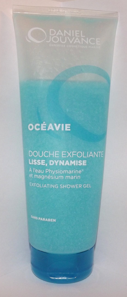 Passons maintenant à la Douche Exfoliante de la gamme Océavie. C’est un gel douche exfoliant, on peu l’utiliser simplement comme un gel douche exfoliant (on se masse sous la douche, 1 à 2 fois par semaine) et il créera une mousse exfoliante, mais je l’utilise comme un gommage, c’est à dire une à deux fois par semaine aussi, mais je me masse tout le corps avec le gel sur peau humide, sans rester sous l’eau. Les grains sont très petits et très doux, ce qui m’a fait douter de son action exfoliante au début… Quand le gel entre en contact avec la peau humide il se met à mousser créant une crème blanche facile et agréable à masser. Niveau texture c’est un gel bleuturquoise avec de petits grains blancs.