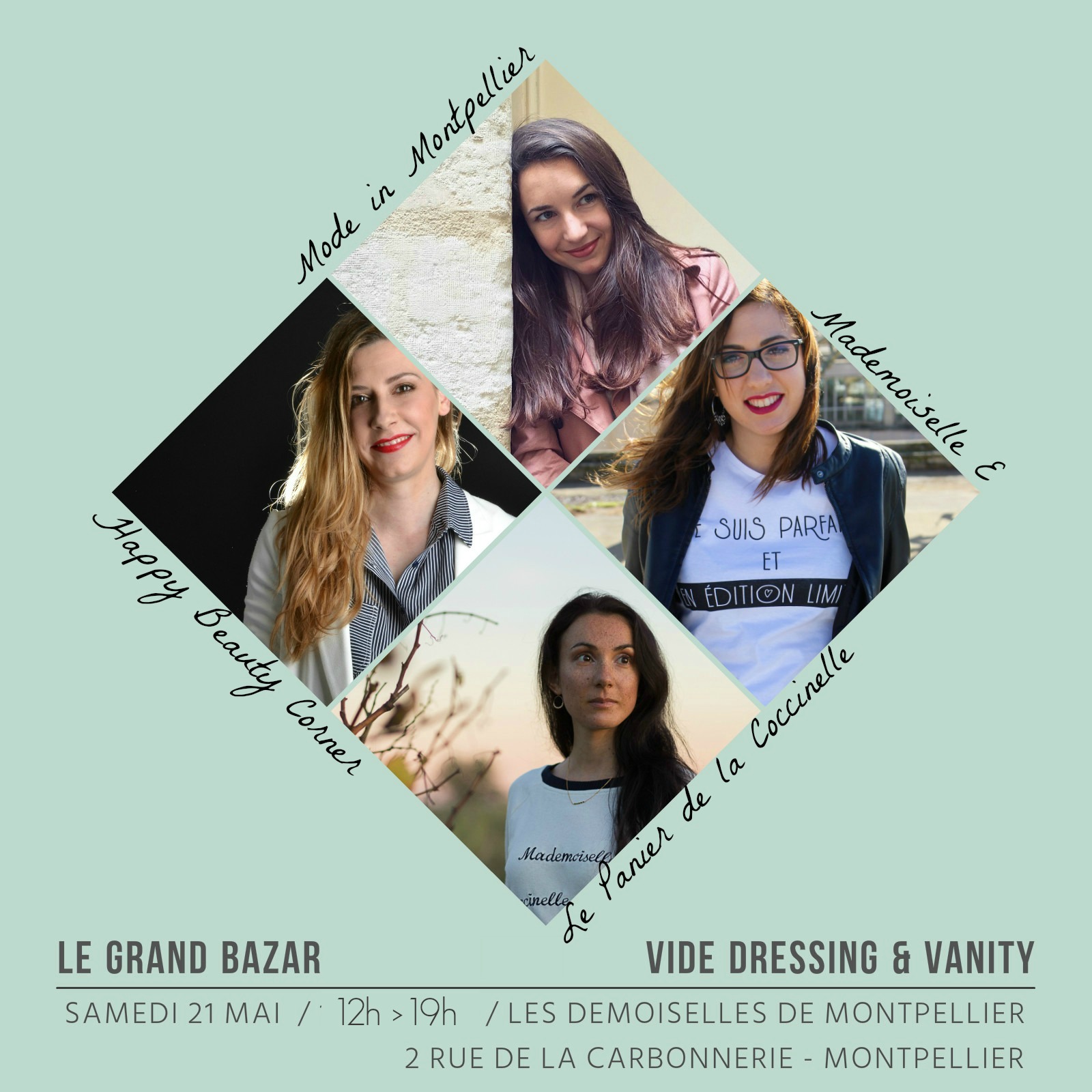 Ce Samedi 21 Mai, c’est le Grand Bazar de Montpellier, à cette occasion, je vous propose de nous retrouver, Mademoiselle E, Mode in Montpellier, Le Panier de la Coccinelle et moi chez Les Demoiselles de Montpellier, un Salon de Thé adorable situé 2 rue de la Carbonnerie à Montpellier. On vous attend de 12h à 19h pour un Vide Dressing et Vanity, avec de super bonnes affaires : Fringues, Sacs, Chaussures, Accessoires, Cosmétiques, Make-up… et tout à petits prix !! L’occasion de refaire son Dressing avant l’été ou de se rencontrer tout simplement, dans un lieu trop mignon 😉