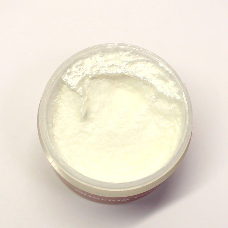 La Crème de rasage de Luxe se présente dans un gros pot , c’est une sorte de crème fouettée de savon, plus aérien qu’une crème, mais pas vraiment une mousse. La formule est 100% naturelle, elle contient notamment de l’aloe vera bio, de la glycérine, de l’huile de tournesol, du beurre de karité certifié biologique, du thé blanc bio, du thé vert, des extraits de calendula, camomille, lavande, amande douce, consoude, trèfle, vitamines E, A & D, racine de guimauve, grain d’avoine, huile de maïs…