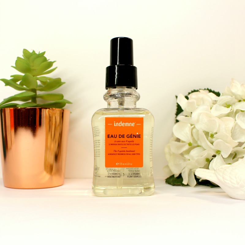 En sortant de la douche, je vaporise toujours quelque chose sur le visage, suivant l’humeur, c’est soit de l’eau thermale ou depuis quelques temps, j’utilise L‘Eau de Génie d’Indemne. J’aime beaucoup ce genre d’Eau à tout faire qui hydrate, purifie, tonifie… C’est un cocktail d’eaux de fruits : citron, pamplemousse, abricot, tomate avec une pointe d’huile essentielle de citron.
