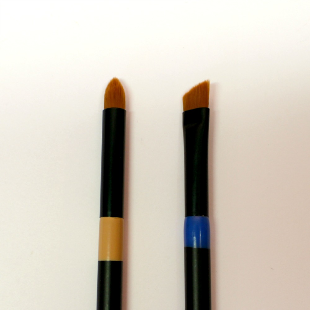 J’ai reçu le Pinceau n°01, avec les anneaux bleus, un anneau est censé être plus clair que l’autre, honnêtement sur ce pinceau ce n’est pas flagrant. Comme je viens de vous l’expliquer, le côté Pinceau Estompeur est parfait et a plusieurs usages (appliquer, estomper, intensifier), le Pinceau Eyeliner est bien rigide mais assez souple, la tranche est longue et fine, bref, c’est un excellent pinceau pour les eyeliner crèmes ou les fards à humidifier.