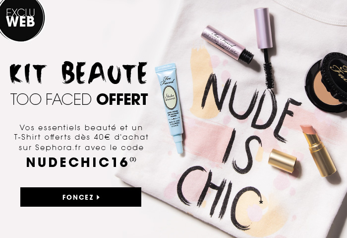 Et voici un petit coup de pouce si vous êtes tentées ^^ : -30 % sur le deuxième produit acheté avec le code FREBOFF OU un KIT Too Faced offert avec 4 minis produits et un tee-shirt à partir de 40 € d’achats avec le code NUDECHIC16 chez Sephora en ce moment ! (jusqu’au 29/02 sur le produit le moins cher, jusqu’au 27 pour le kit !!).