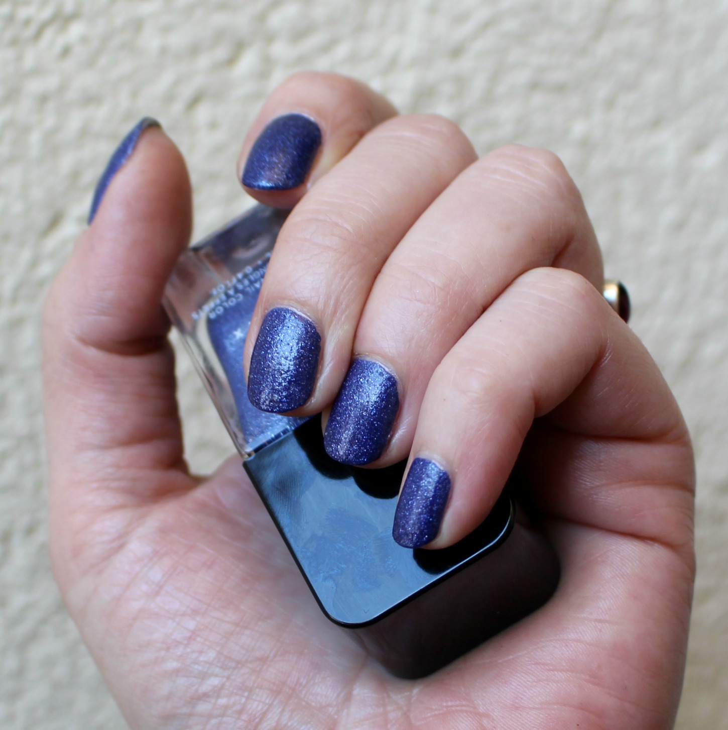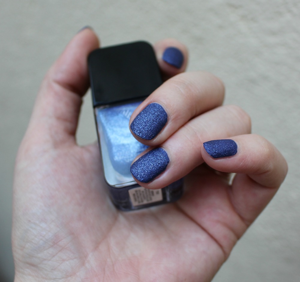 La couleur dans le flacon est juste à tomber un bleu nuit/marine avec paillettes à gogo. Je savais que ce vernis était à effet, mais je ne savais pas lequel ^^ Je m’attendais à une sorte de vernis holographique ou pailleté et c’est en réalité un vernis “sablé”, avec paillettes en relief et effet mat à la clef…